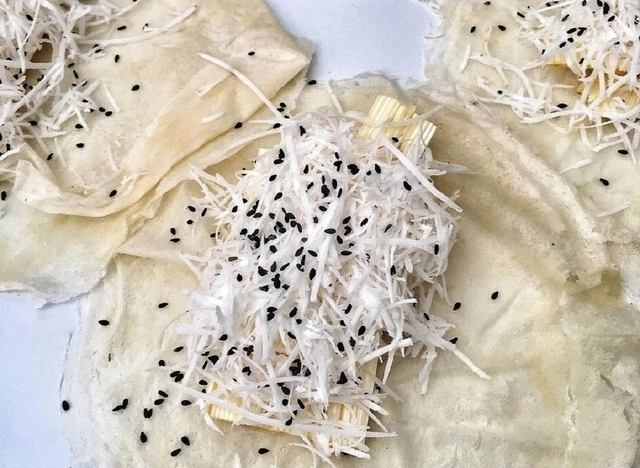 The sweet popiah is simpler to make as the filling includes a crispy sugar candy, shredded coconut, and some black sesame seeds.