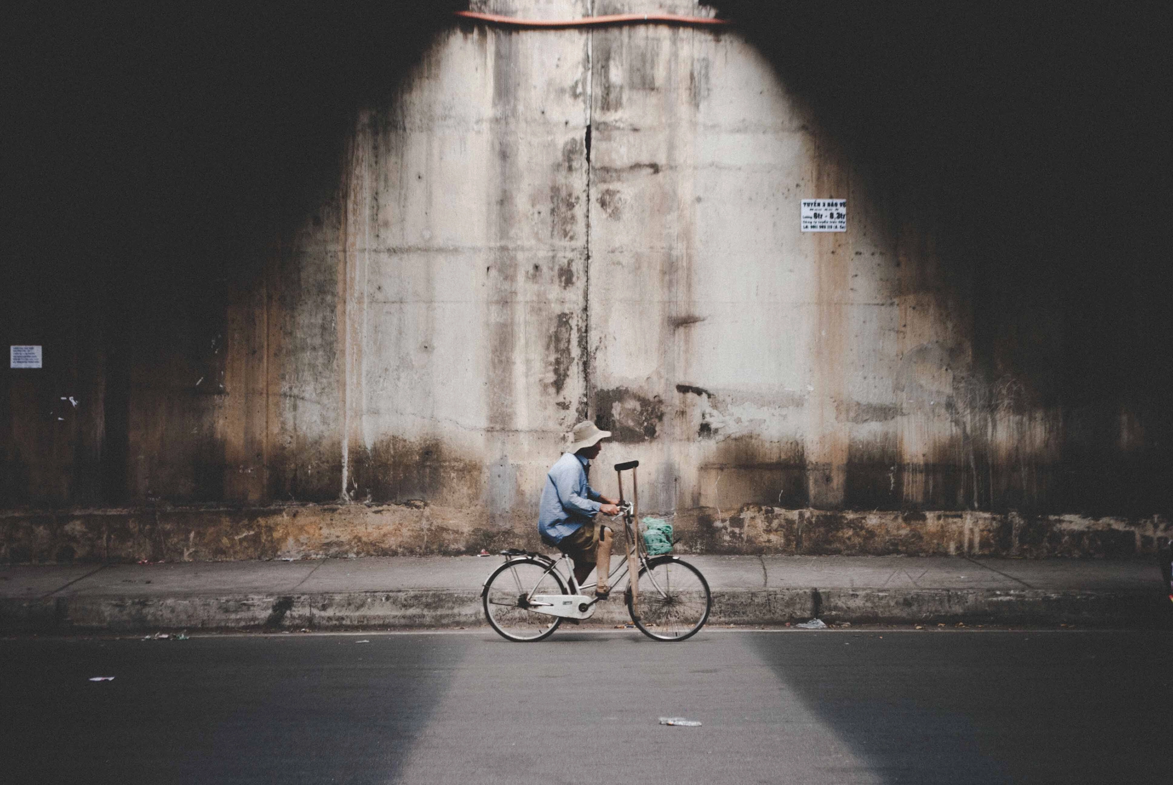 A cyclist with a crutch is caught in triangle and rectangle of light.