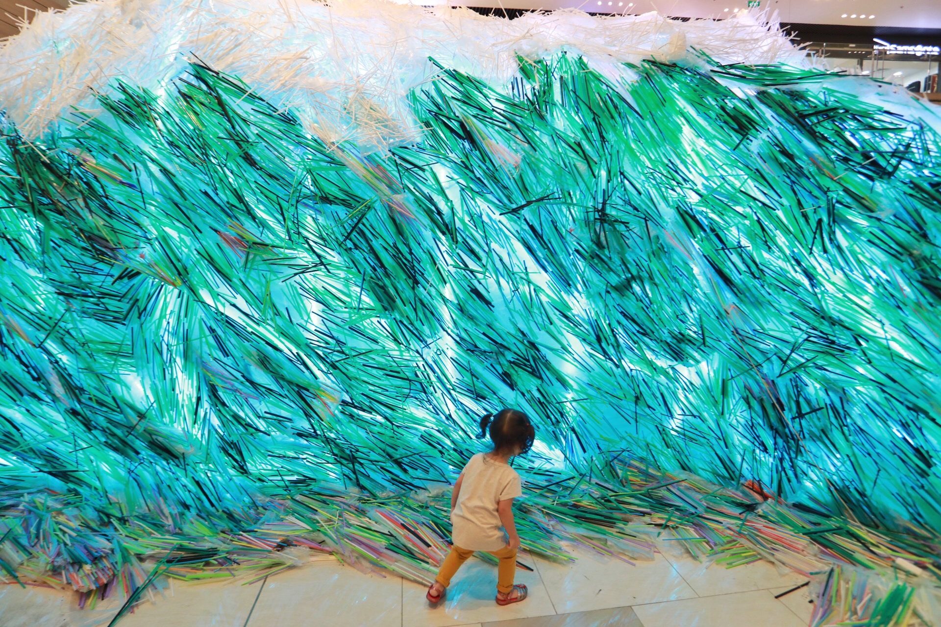 Blue, green, and black straws are used for sea waves and the foam is made with white straws.