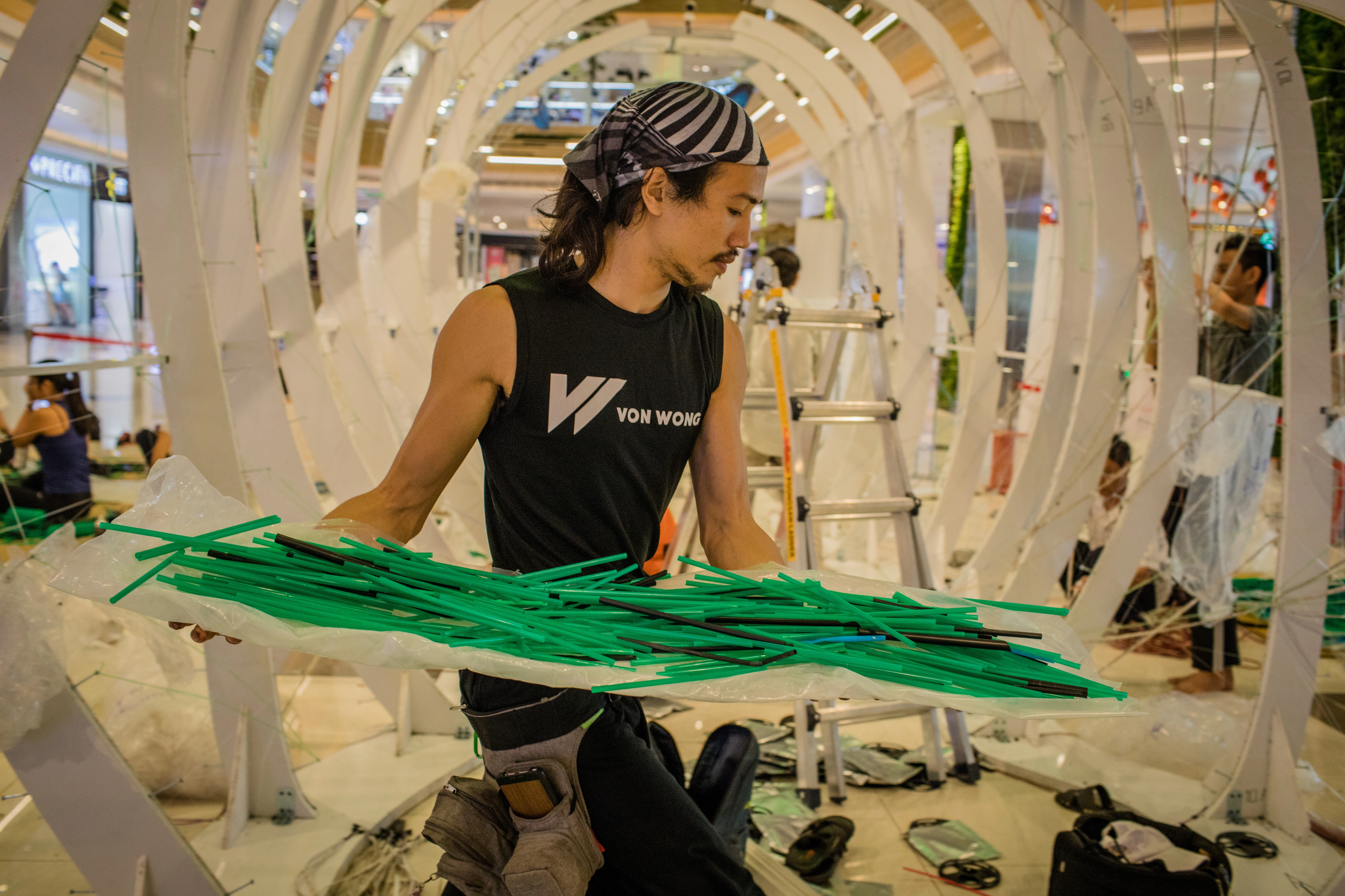 Prior to the installation days, they had been working with Zero Waste Saigon, which co-sponsors the project with Starbucks Vietnam, to help with sorting and counting straws.