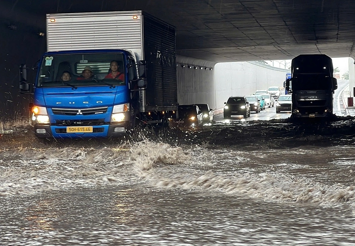 On Vo Chi Cong Street, there was a four-kilometer traffic jam on the direction leading from Noi Bai airport to downtown Hanoi. Commuters spent hours stranded, with some turning to the metro or wading through waist-deep water to reach work.