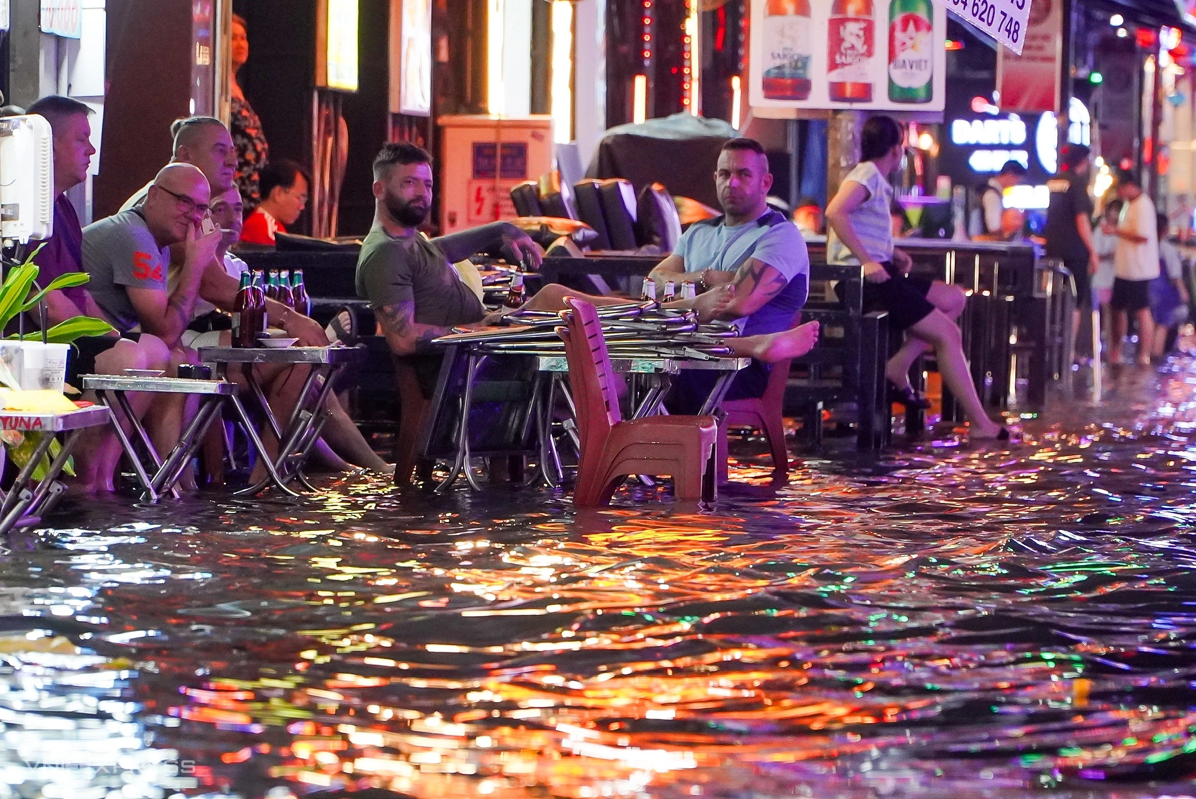 Groups of foreign tourists drinking on sidewalks, keeping their feet on tables as water lapped 10–20 centimeters high on Bui Vien walking street, one of Ho Chi Minh City’s busiest nightlife hubs, on Nov. 8, 2025. Photo by VnExpress/Gia Minh