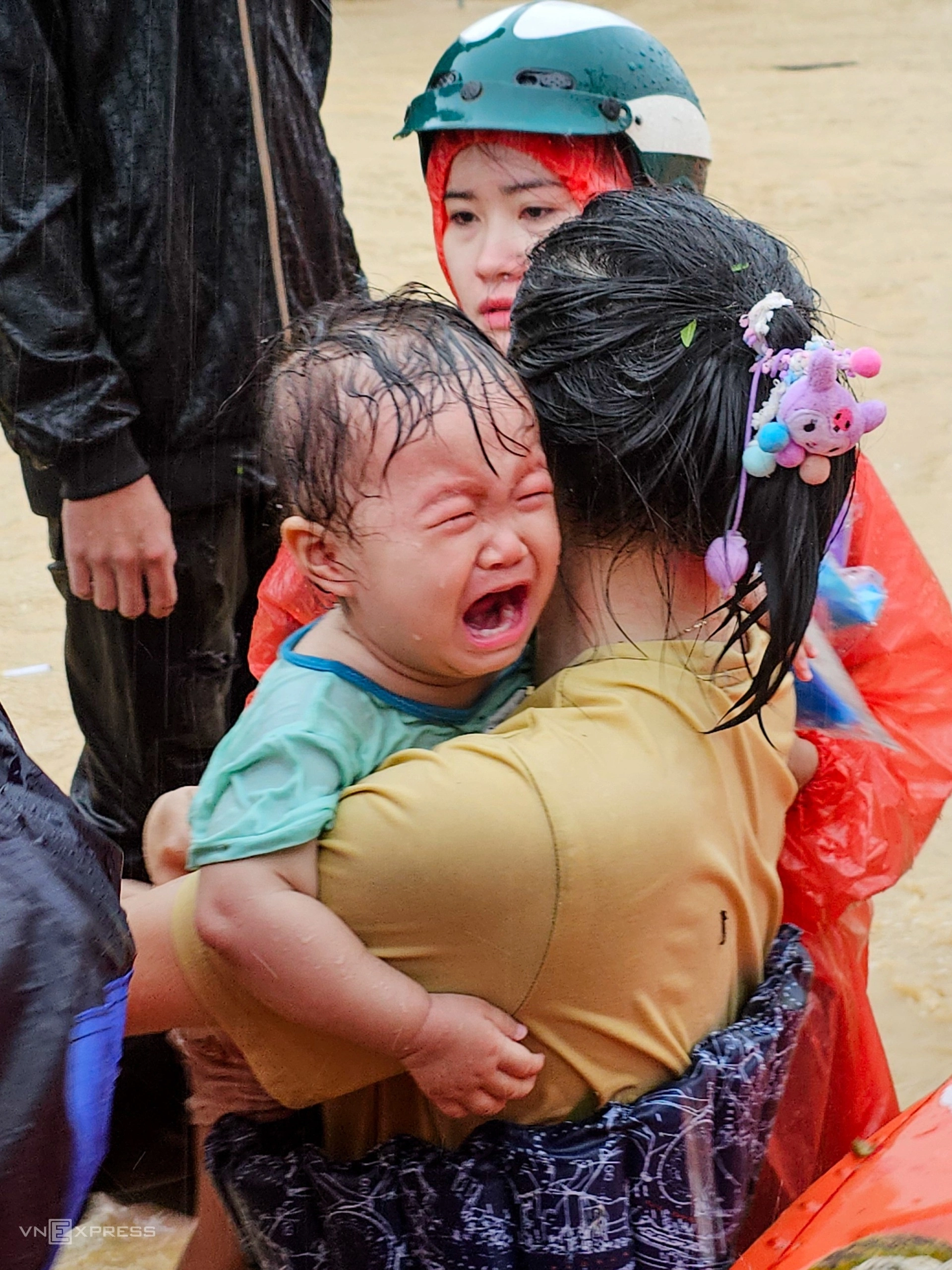 A young child, soaked, burst into tears while being carried by his mother out of the flooded zone in Tay Nha Trang Ward in Nha Trang, Khanh Hoa Province, Nov. 20, 2025. Photo by VnExpress/Bui Toan