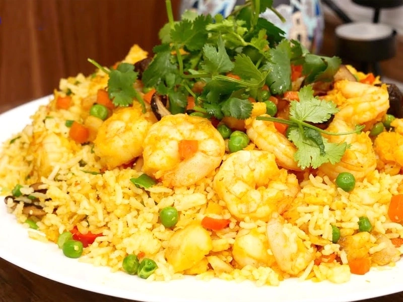 Fried seafood rice is also a must-try dish in Can Gio. A plate includes fresh seafood like prawns and squid, fried eggs, shredded carrots and other green vegetables.