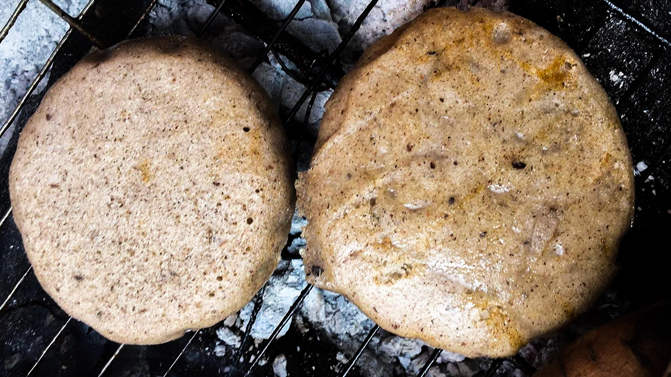 the cakes. The ground seeds are kneaded into round cakes, larger than a hand's size. These cakes are then steamed and charcoal-baked, ideally