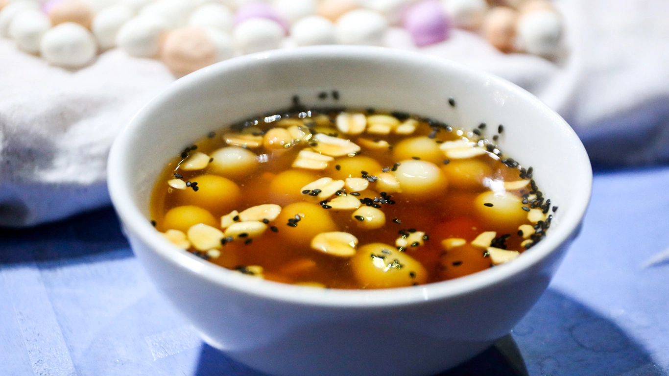 A bowl of thang den captures diners' attention with its vibrant ginger-colored sugar water and colorful glutinous rice balls. Photo by VnExpress/Xuan Phuong