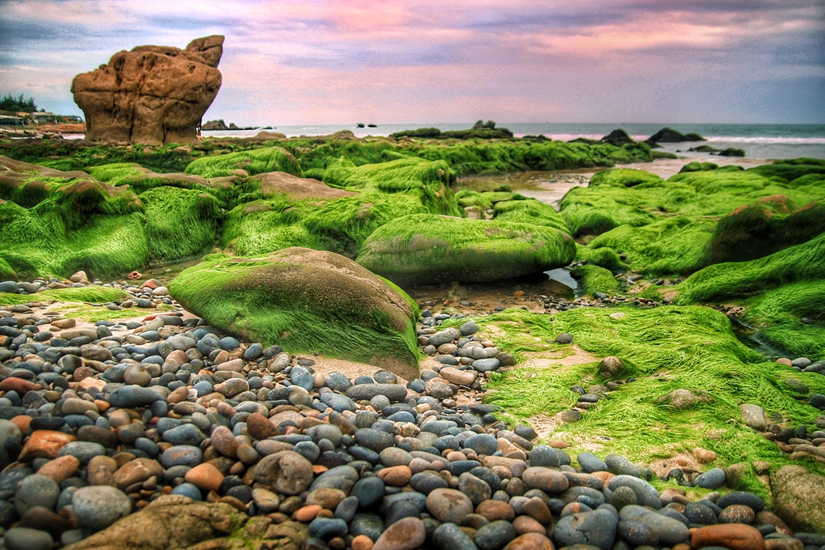 The Co Thach beach, which seems deserted for most of the year except the green mossy season, has millions of seven-colored small stones stretching for about one kilometer. These were naturally formed by the effects of tides and waves over thousands of years.