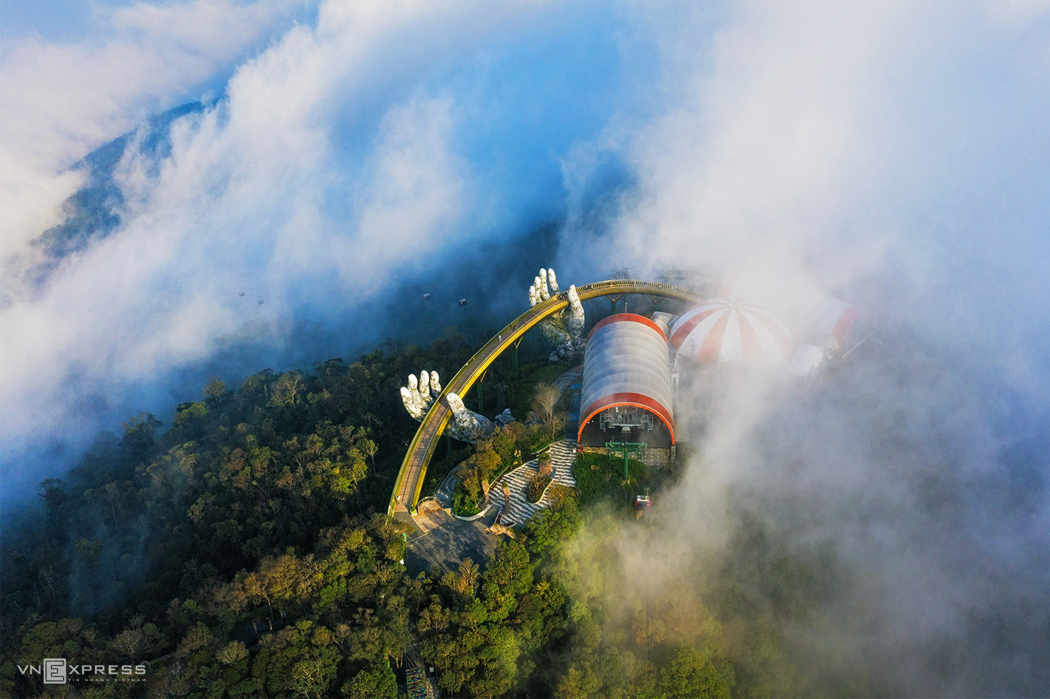 The Golden Bridge on Ba Na Hills Resort in the Truong Son mountain range, 150 meters long and 12.8 meters wide, became a popular tourism symbol and garnered global attention from international media soon after it opened to tourists in 2018.