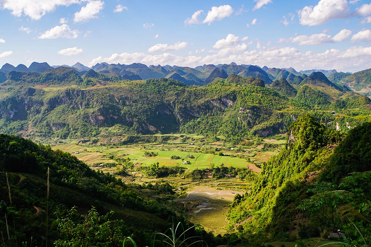 The most popular route to the east leads you through a mature karst landscape, characterized by limestone towers. Layers of karst terrain form the base for Ban Gioc, the fourth largest border waterfall in the world. The Vietnamese part of the falls extend to 150 meters through a dense canopy.
