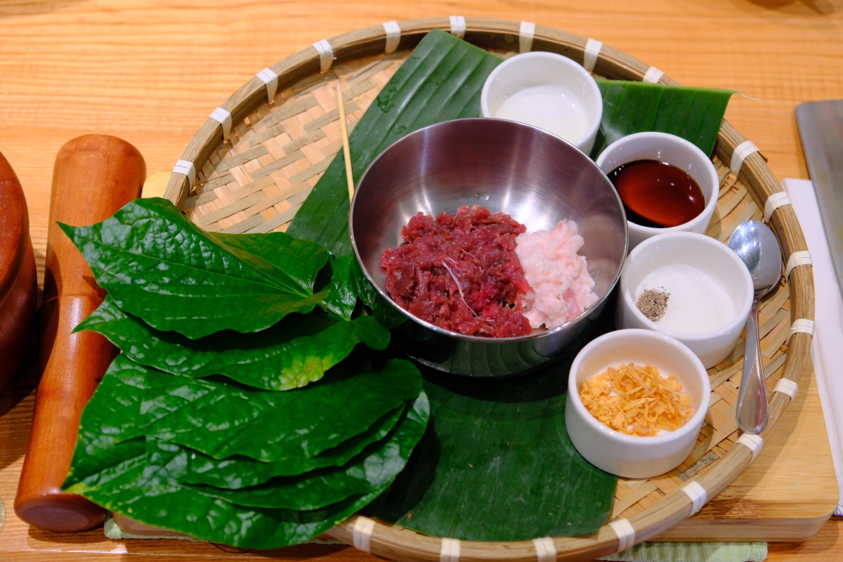 The side dishes for bo la lot, including noodle rolls and slices of fresh pineapple and starfruit, were pre-prepared by the class kitchen.