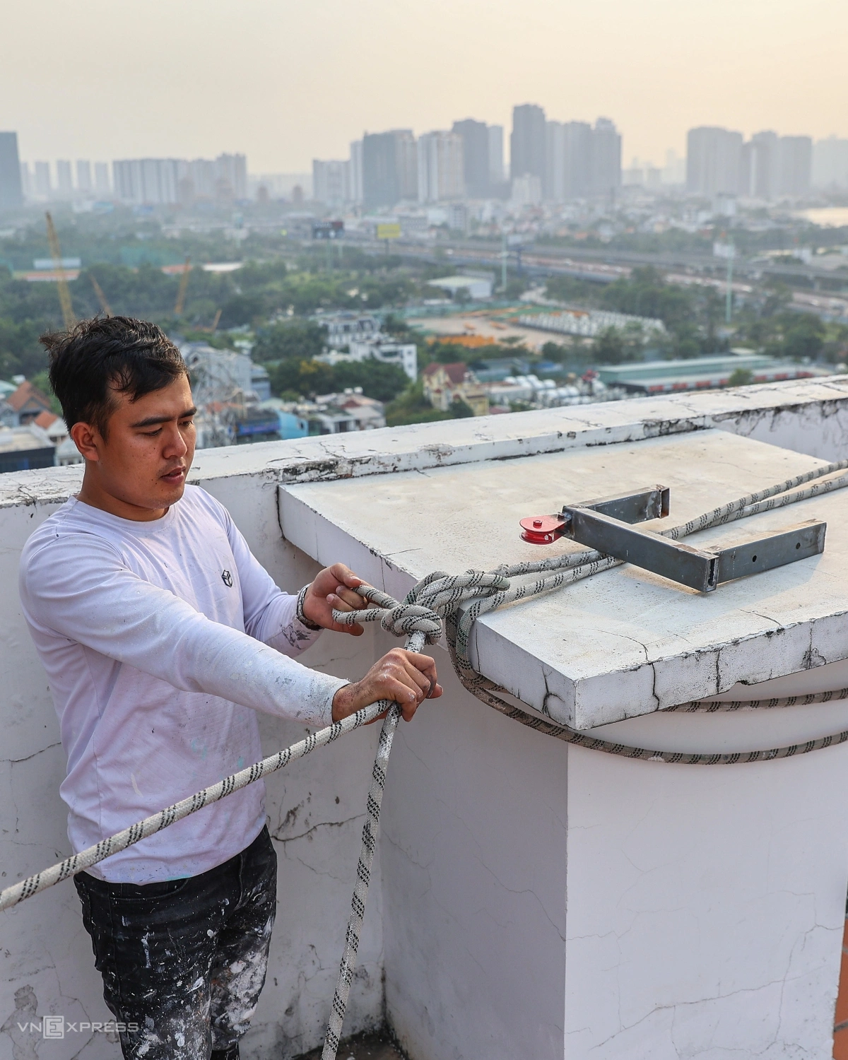 A typical team consists of approximately five workers who rotate through the grueling shifts on the ropes. While their base pay is around VND800,000 per day, they often supplement this income by taking on additional painting and repair tasks requested directly by building residents.